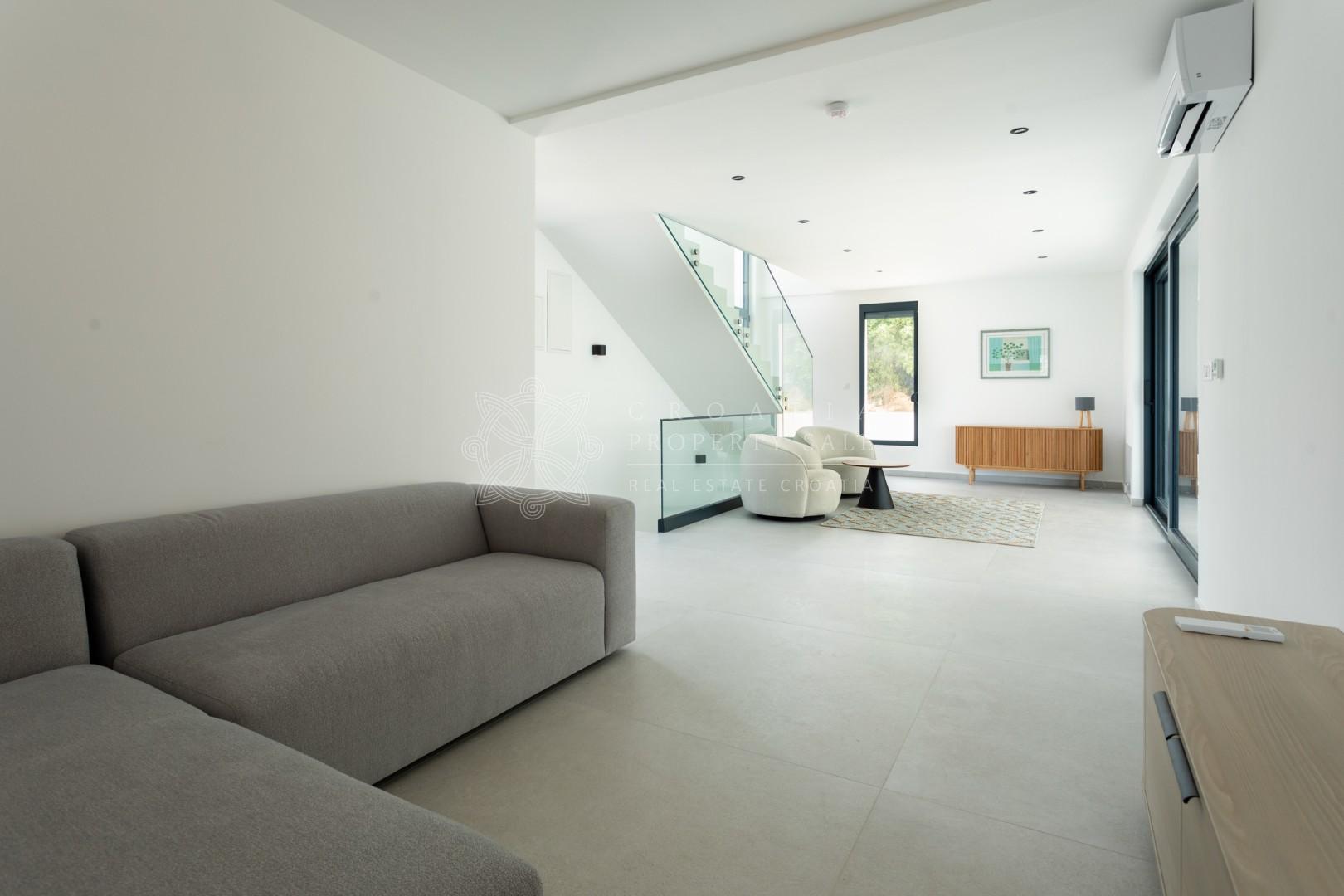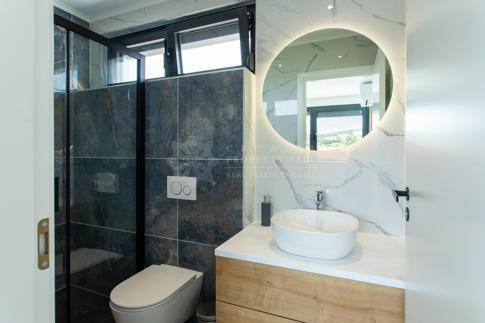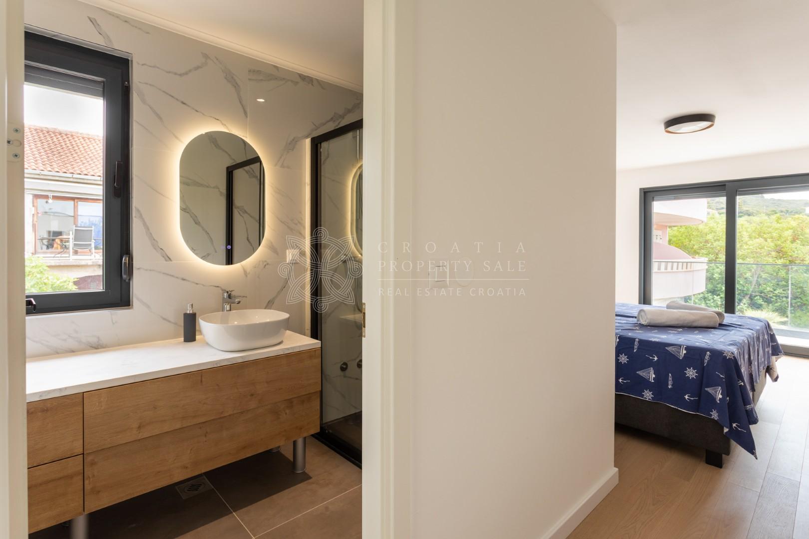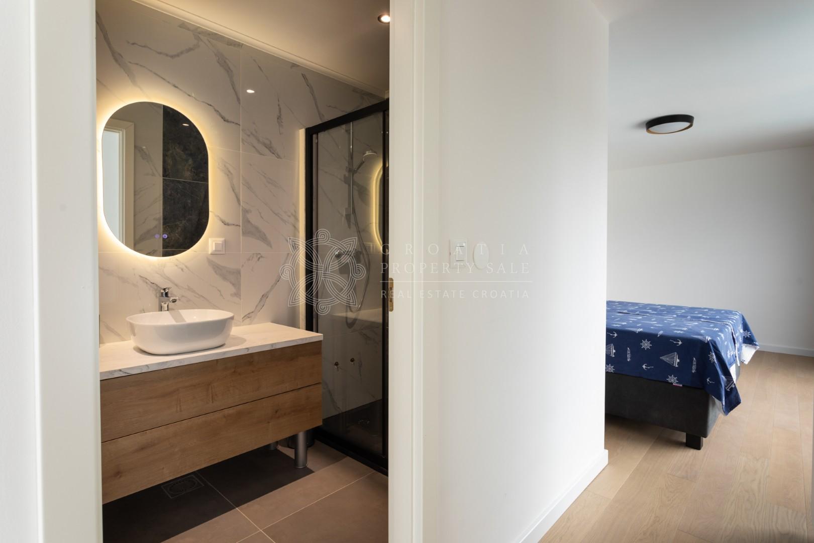 The villa has just been built, a few more details need to be completed. The villa is located on a plot of 690 m2 and has 260 m2 of living space.It is fully furnished and the furniture is included in the price. The villa has parking for 3 vehicles, and there is more parking in the public area next to the street. At the street level there is a small spacious apartment, equipped with a new kitchen and a modern bathroom, a bed and soon other furniture. On the central spacious terrace there is a swimming pool, and a spacious outdoor area for daily socializing, dining and sunbathing. An additional area for sunbathing, surrounded by a glass fence so that you can enjoy the beautiful view of the sea undisturbed, is located on the roof of the apartment.