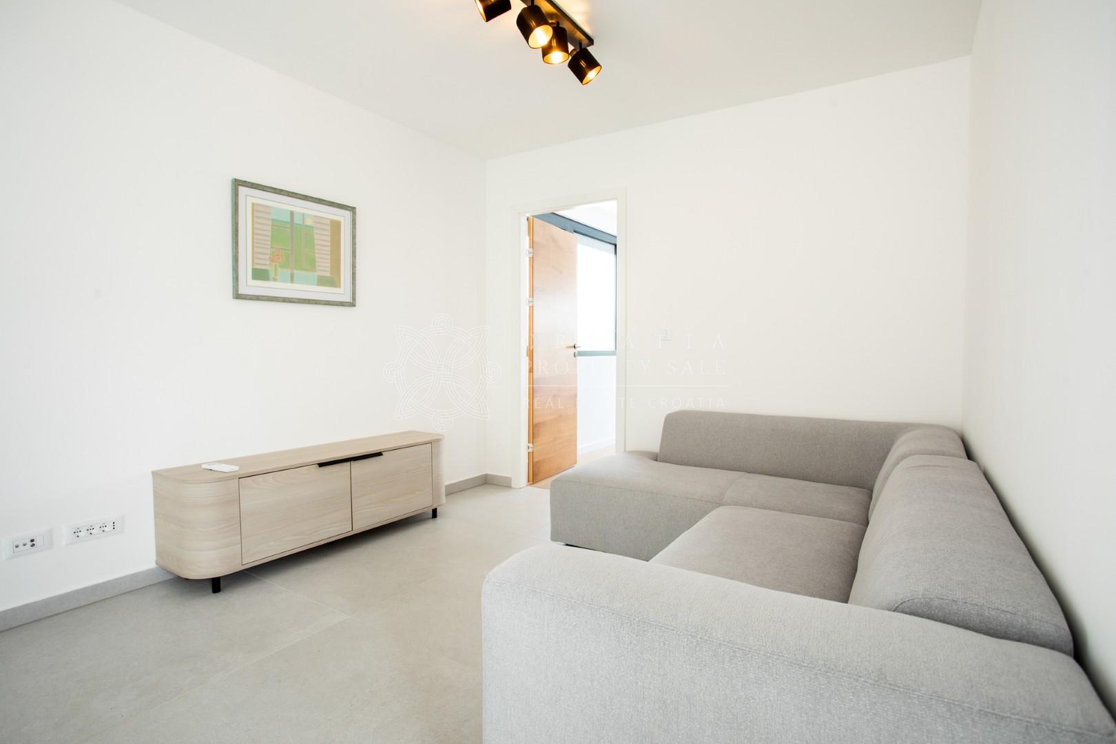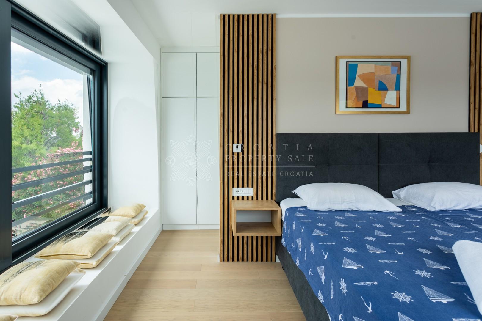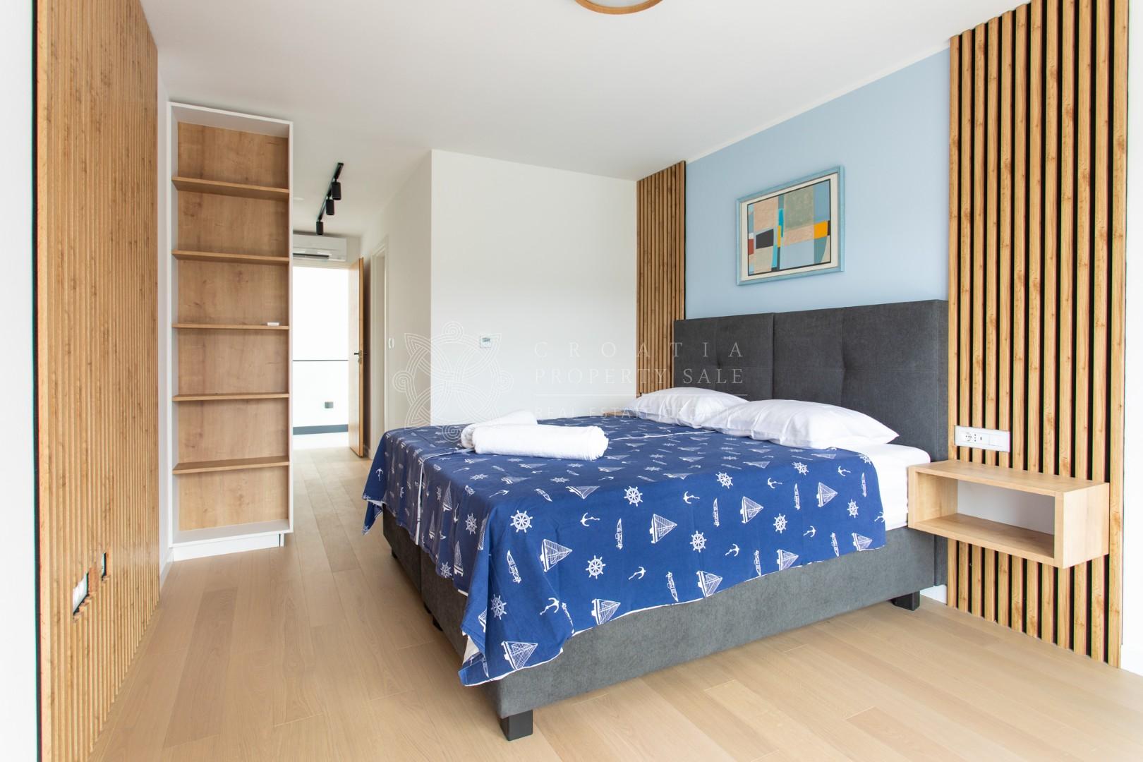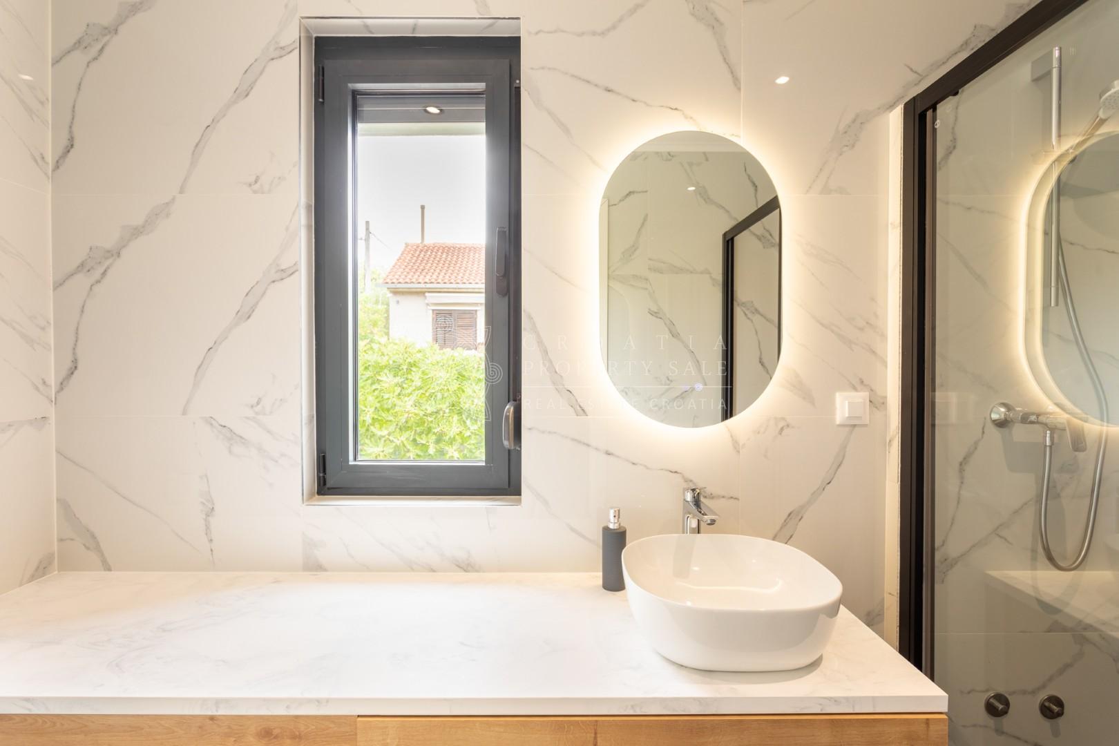 The villa has just been built, a few more details need to be completed. The villa is located on a plot of 690 m2 and has 260 m2 of living space.It is fully furnished and the furniture is included in the price. The villa has parking for 3 vehicles, and there is more parking in the public area next to the street. At the street level there is a small spacious apartment, equipped with a new kitchen and a modern bathroom, a bed and soon other furniture. On the central spacious terrace there is a swimming pool, and a spacious outdoor area for daily socializing, dining and sunbathing. An additional area for sunbathing, surrounded by a glass fence so that you can enjoy the beautiful view of the sea undisturbed, is located on the roof of the apartment.