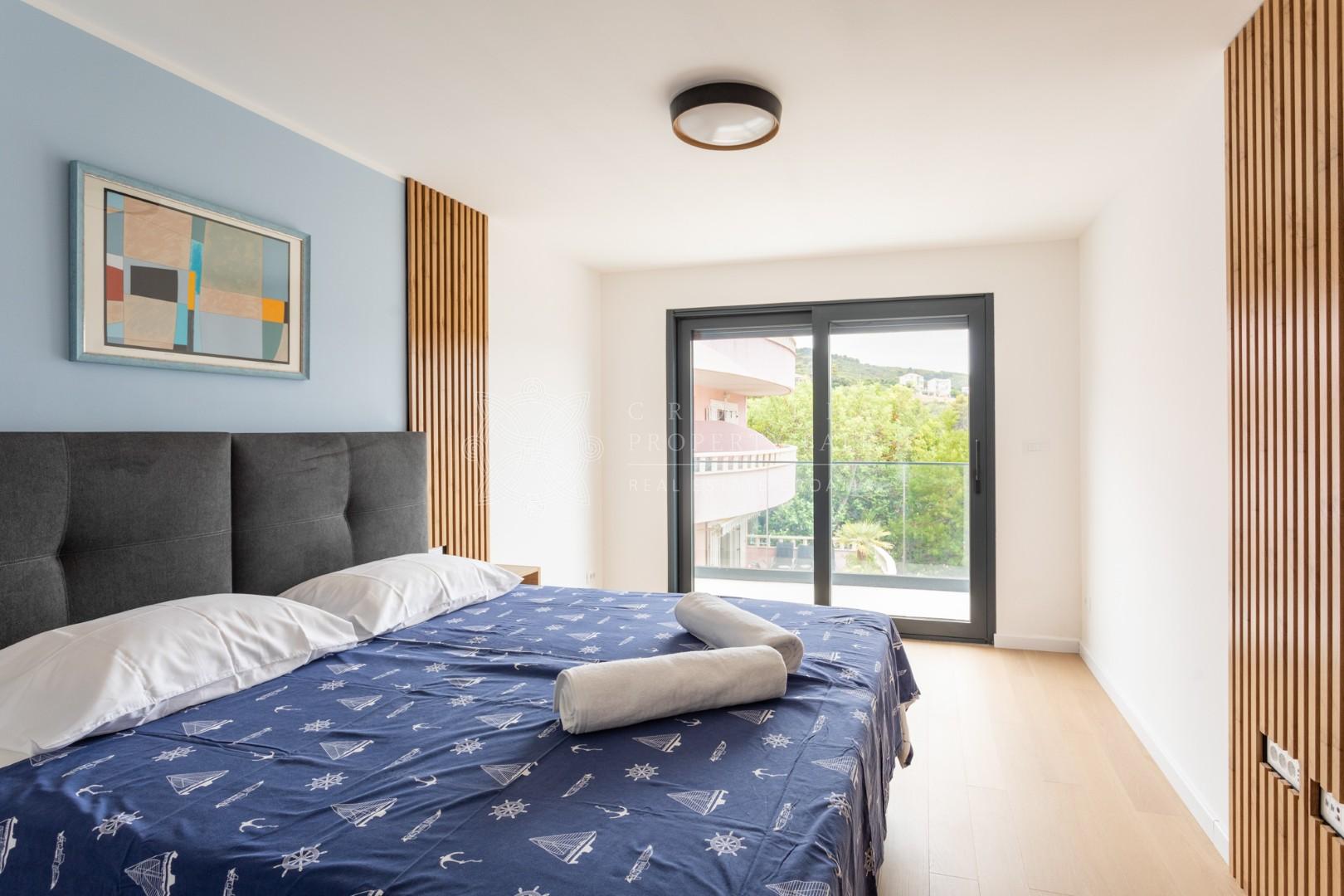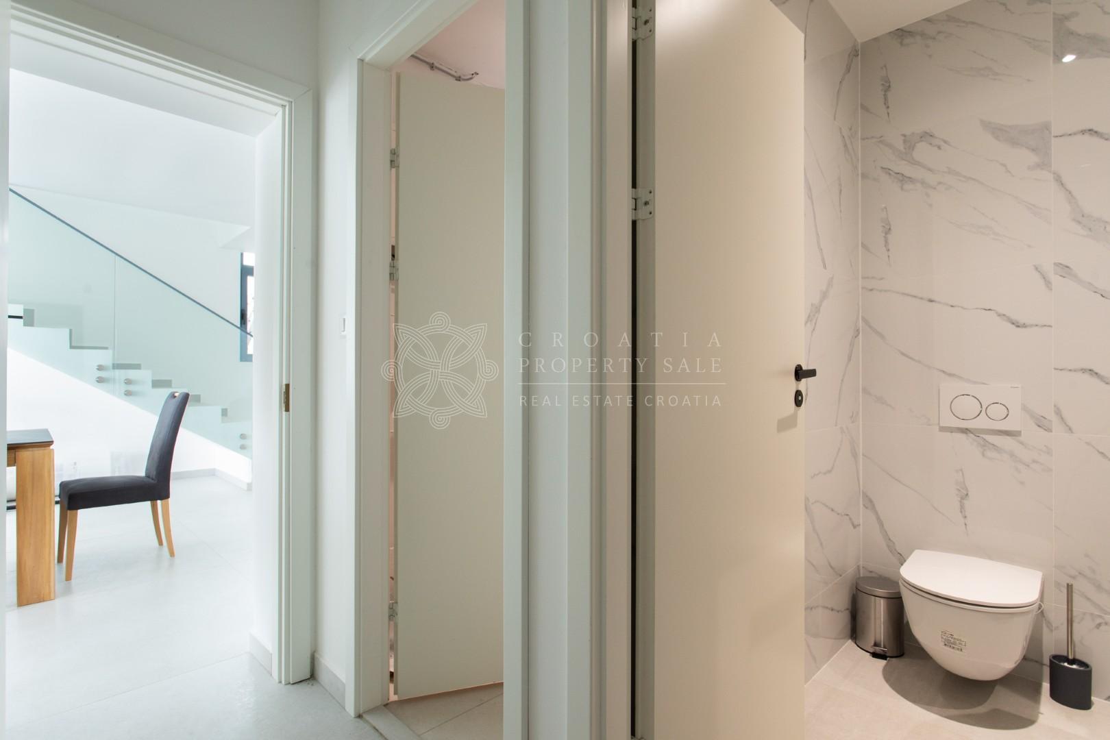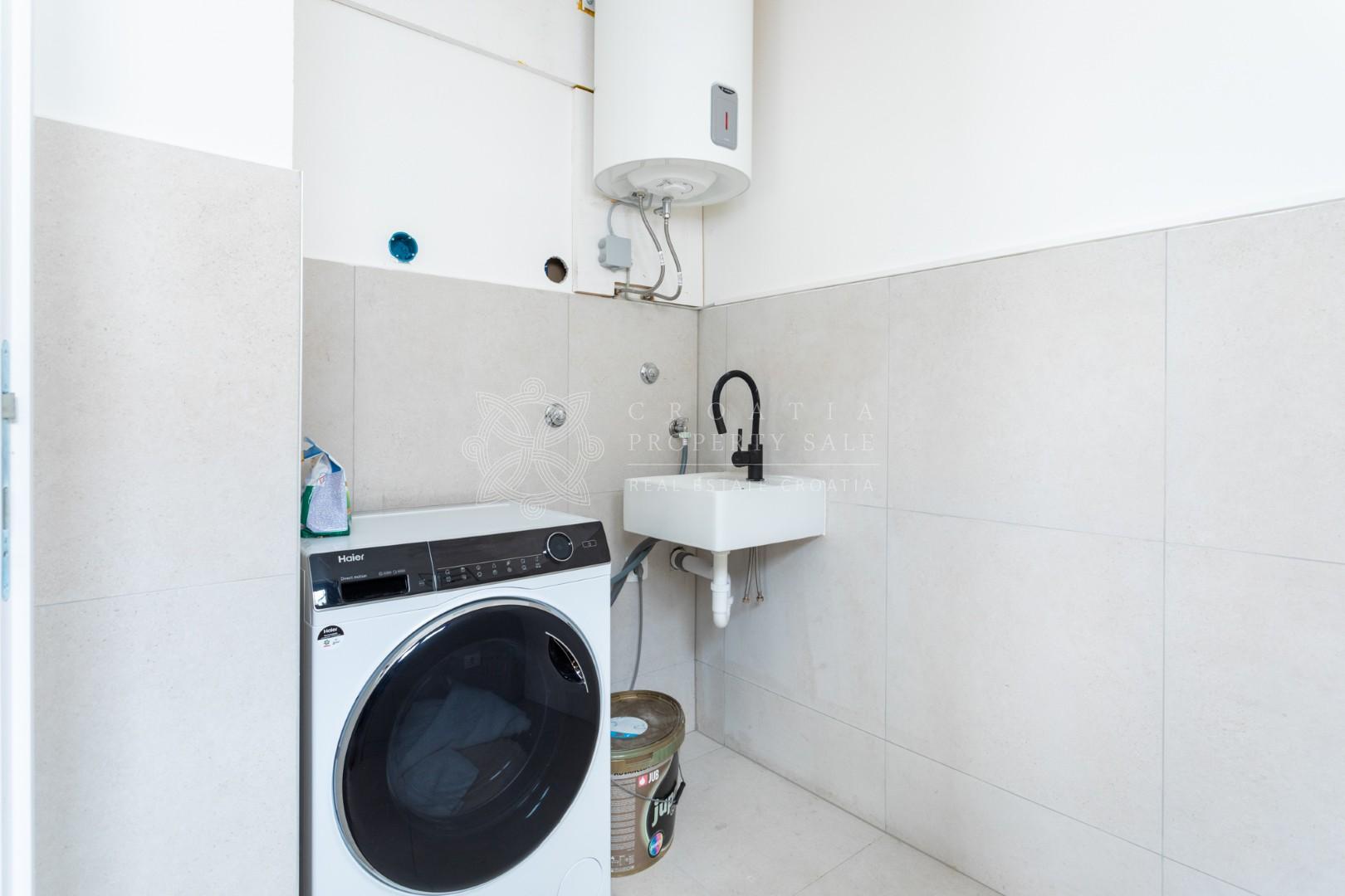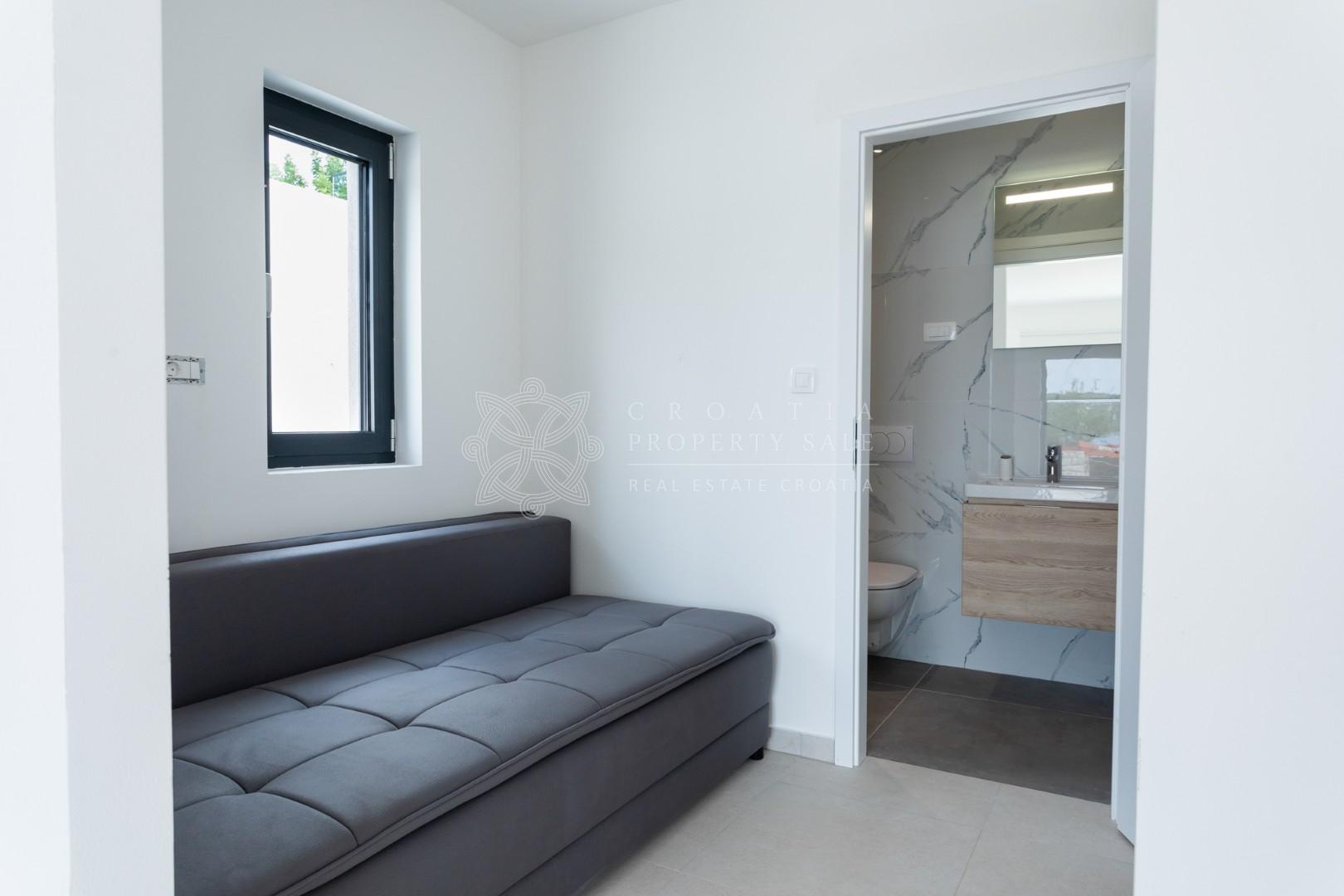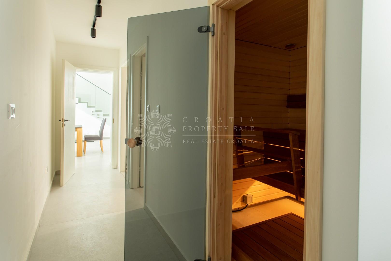 The villa has just been built, a few more details need to be completed. The villa is located on a plot of 690 m2 and has 260 m2 of living space.It is fully furnished and the furniture is included in the price. The villa has parking for 3 vehicles, and there is more parking in the public area next to the street. At the street level there is a small spacious apartment, equipped with a new kitchen and a modern bathroom, a bed and soon other furniture. On the central spacious terrace there is a swimming pool, and a spacious outdoor area for daily socializing, dining and sunbathing. An additional area for sunbathing, surrounded by a glass fence so that you can enjoy the beautiful view of the sea undisturbed, is located on the roof of the apartment.