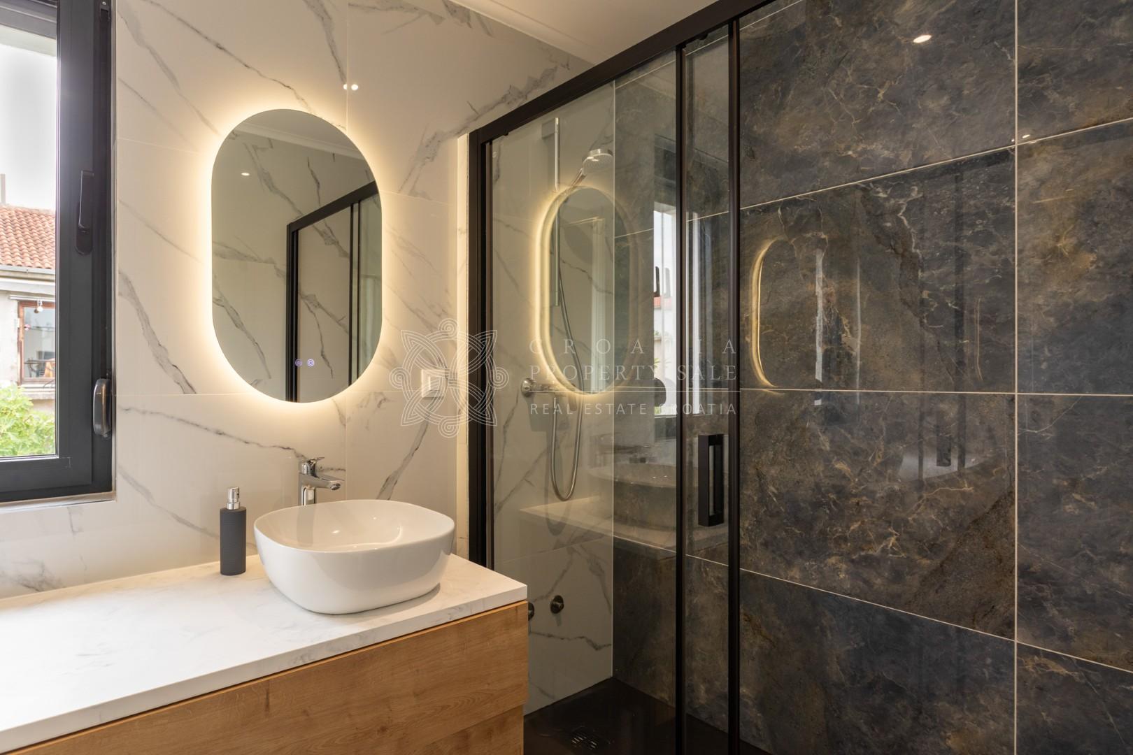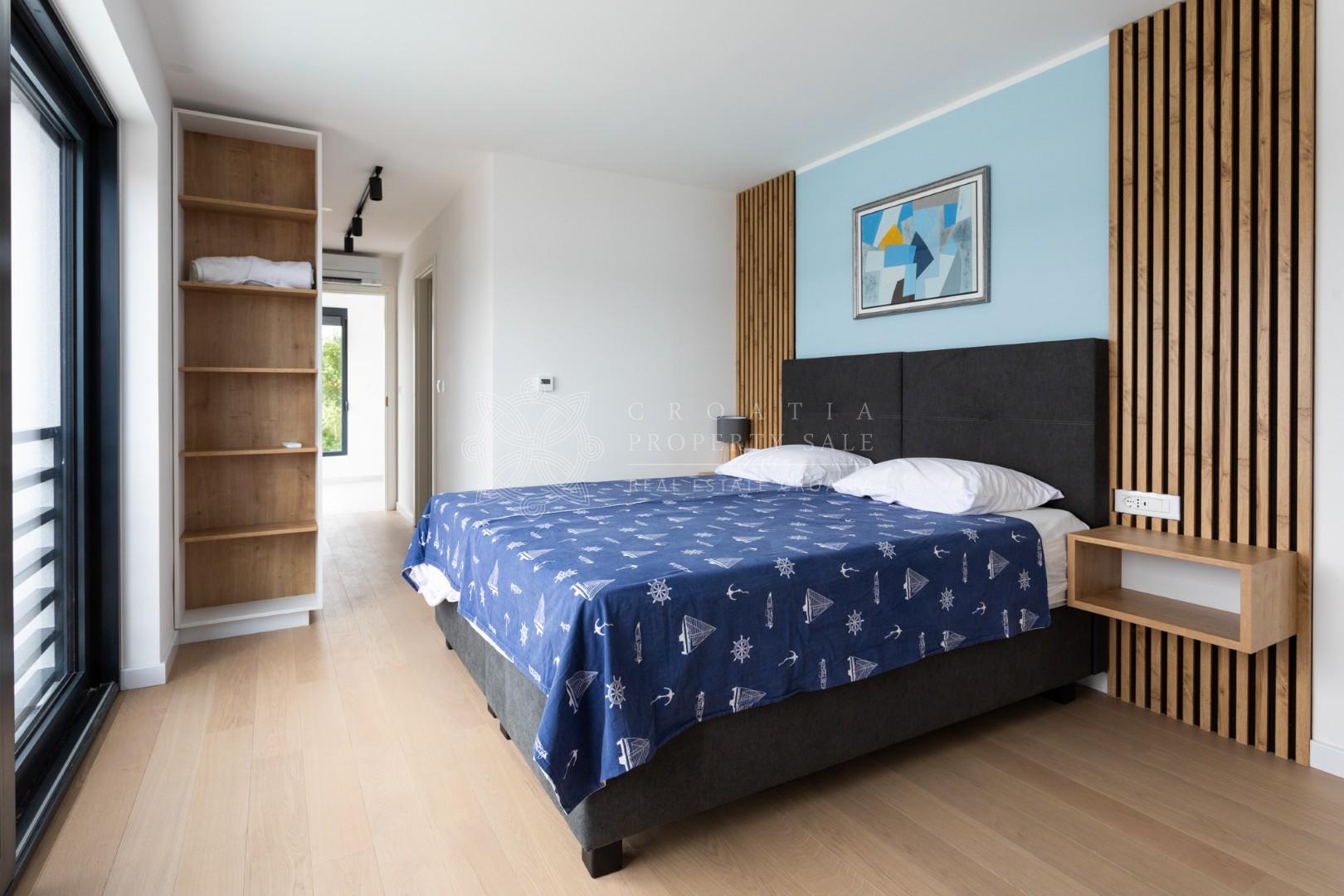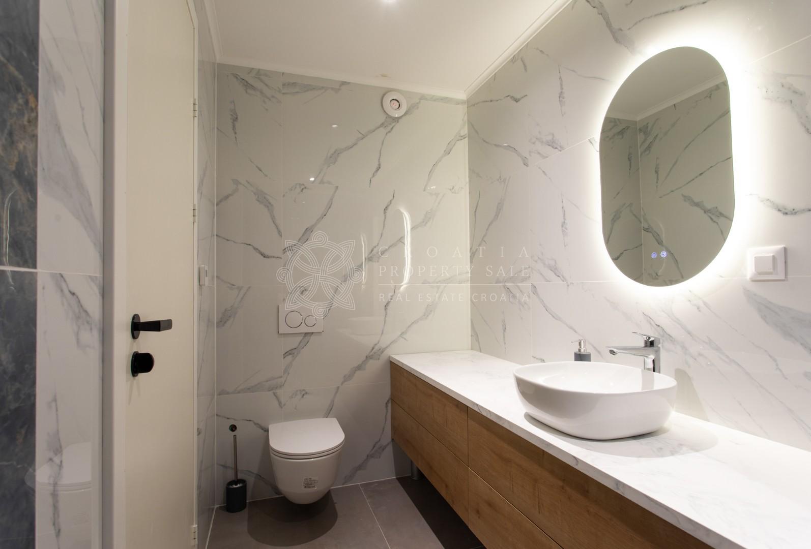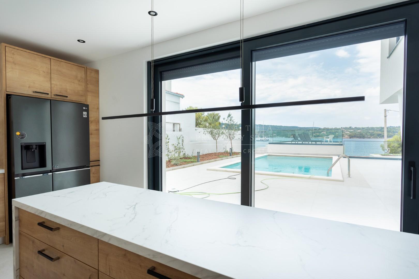 The villa has just been built, a few more details need to be completed. The villa is located on a plot of 690 m2 and has 260 m2 of living space.It is fully furnished and the furniture is included in the price. The villa has parking for 3 vehicles, and there is more parking in the public area next to the street. At the street level there is a small spacious apartment, equipped with a new kitchen and a modern bathroom, a bed and soon other furniture. On the central spacious terrace there is a swimming pool, and a spacious outdoor area for daily socializing, dining and sunbathing. An additional area for sunbathing, surrounded by a glass fence so that you can enjoy the beautiful view of the sea undisturbed, is located on the roof of the apartment.
