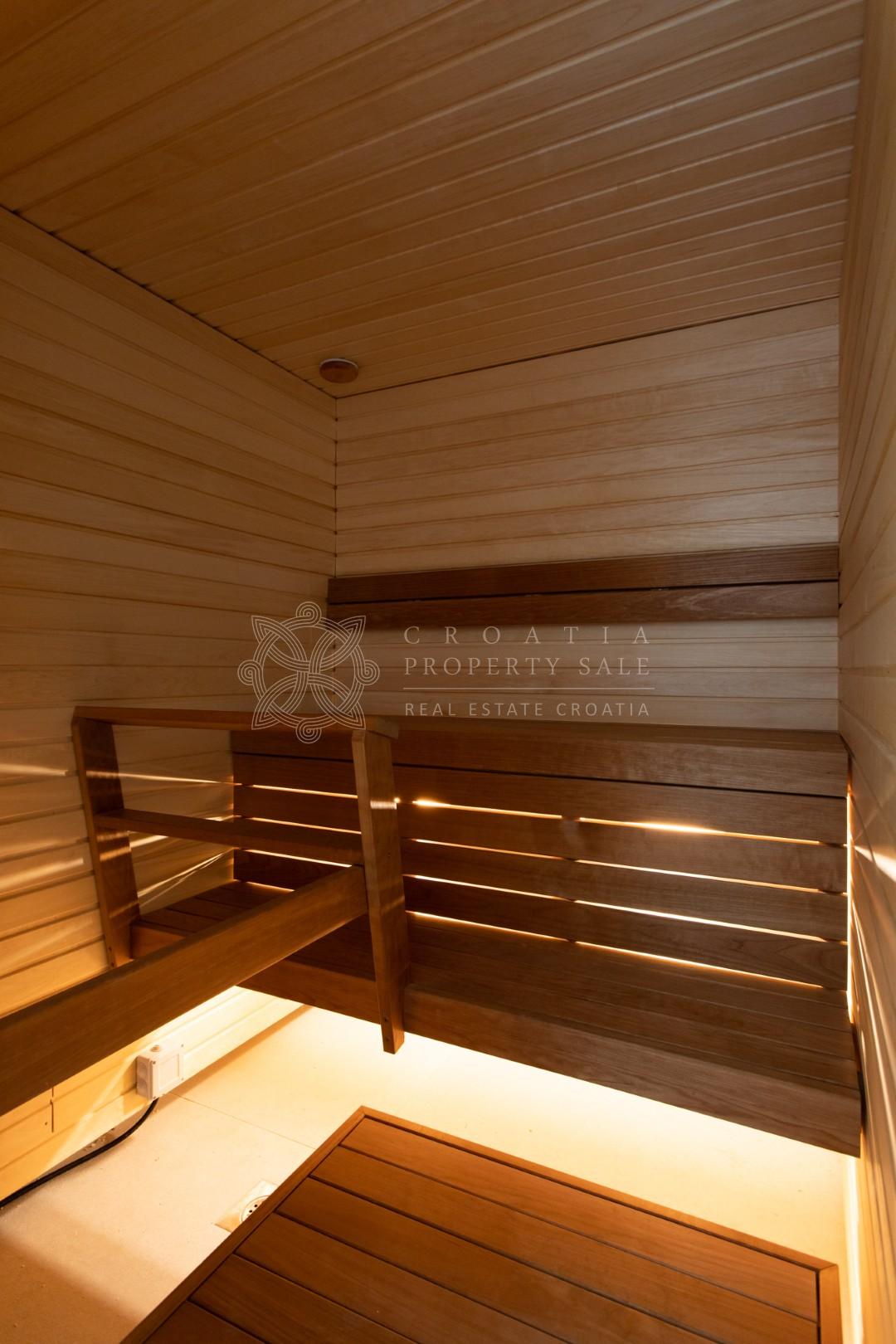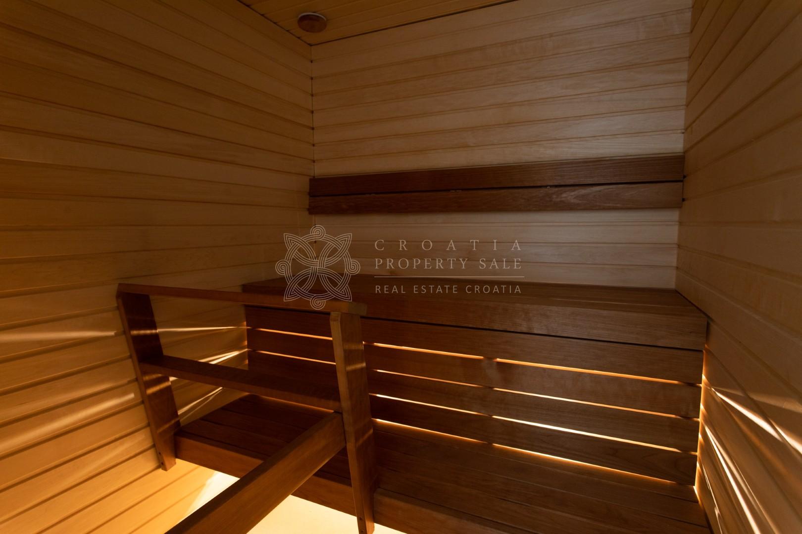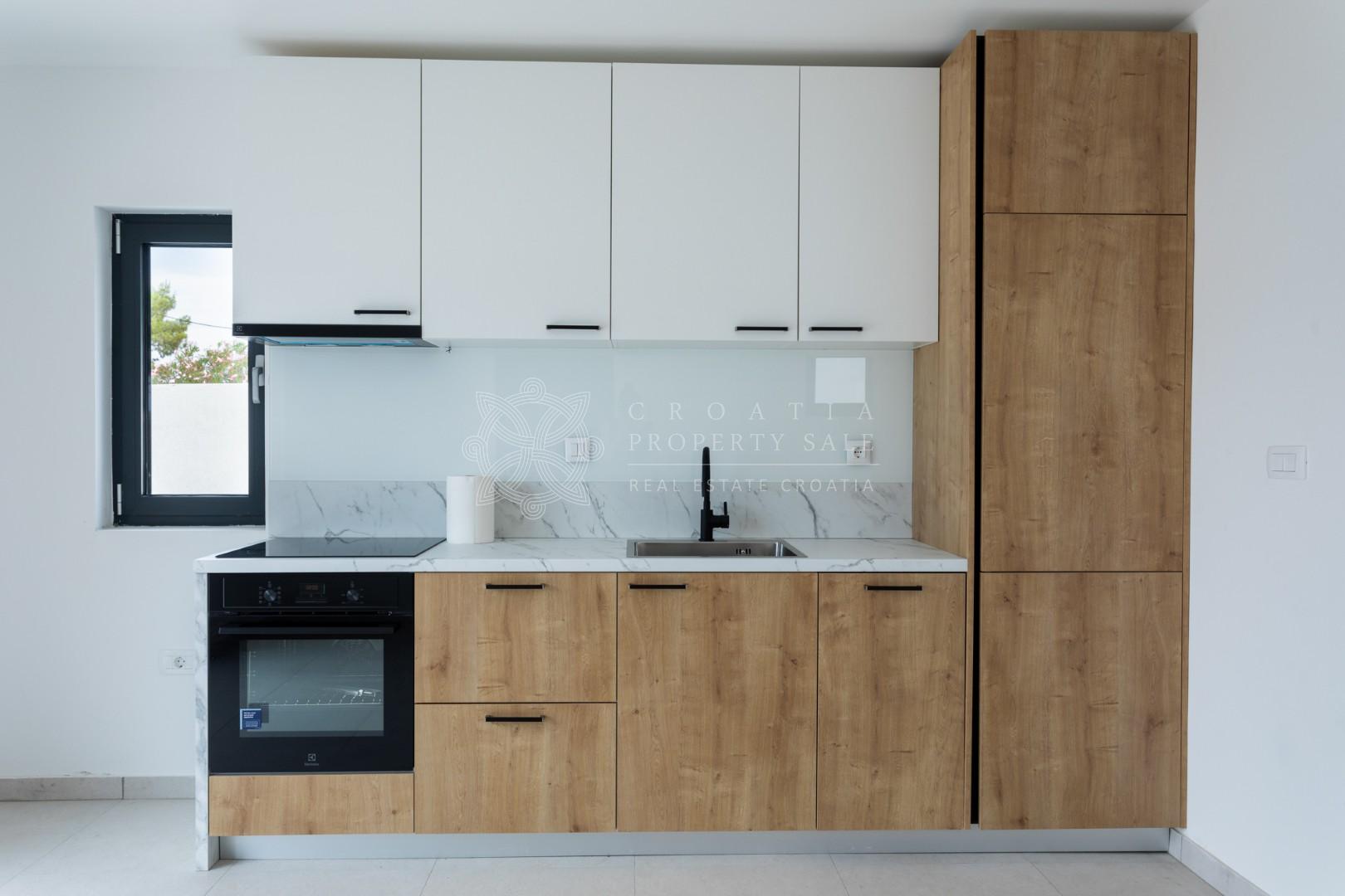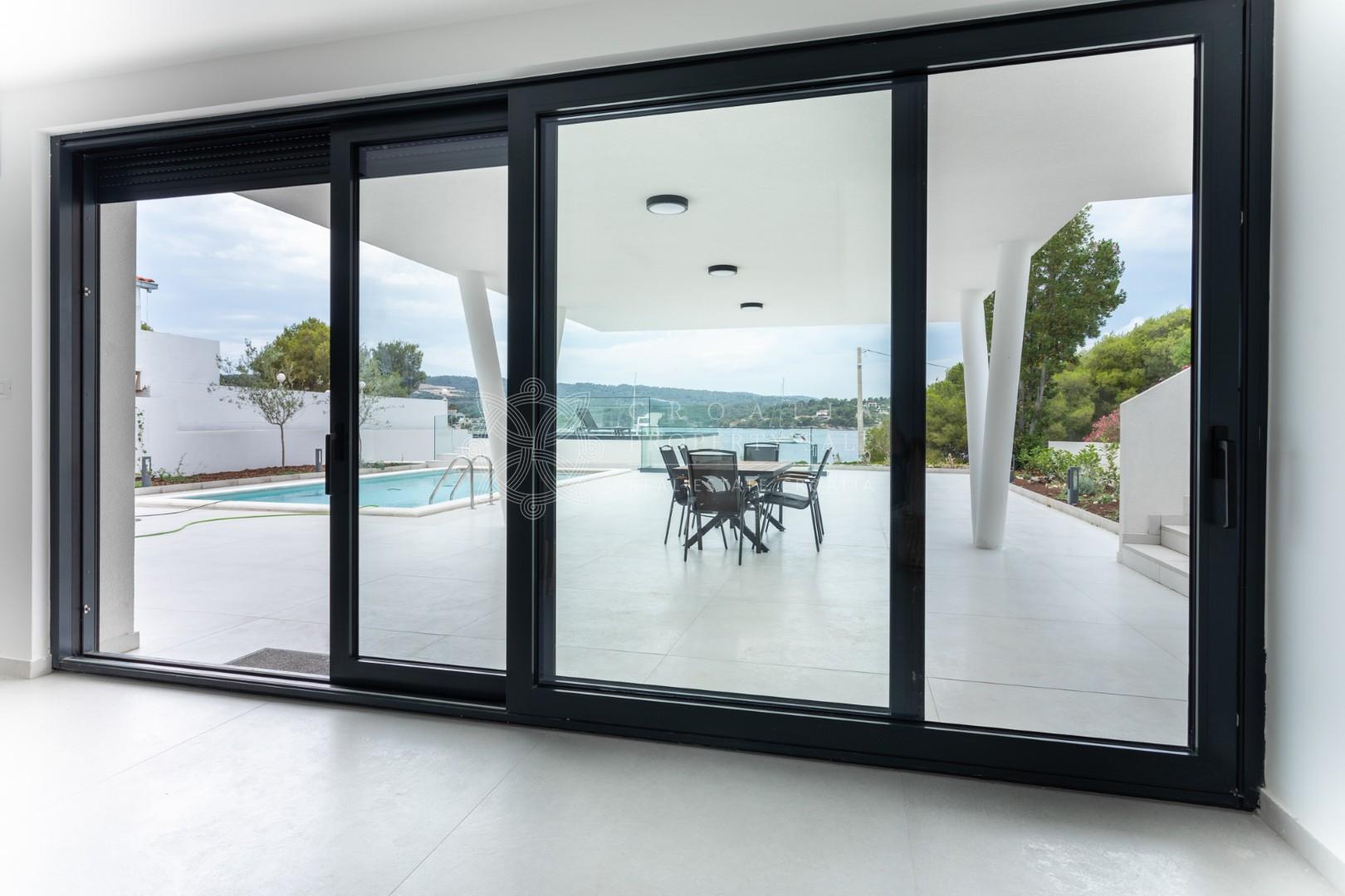The villa has just been built, a few more details need to be completed. The villa is located on a plot of 690 m2 and has 260 m2 of living space.It is fully furnished and the furniture is included in the price. The villa has parking for 3 vehicles, and there is more parking in the public area next to the street. At the street level there is a small spacious apartment, equipped with a new kitchen and a modern bathroom, a bed and soon other furniture. On the central spacious terrace there is a swimming pool, and a spacious outdoor area for daily socializing, dining and sunbathing. An additional area for sunbathing, surrounded by a glass fence so that you can enjoy the beautiful view of the sea undisturbed, is located on the roof of the apartment.