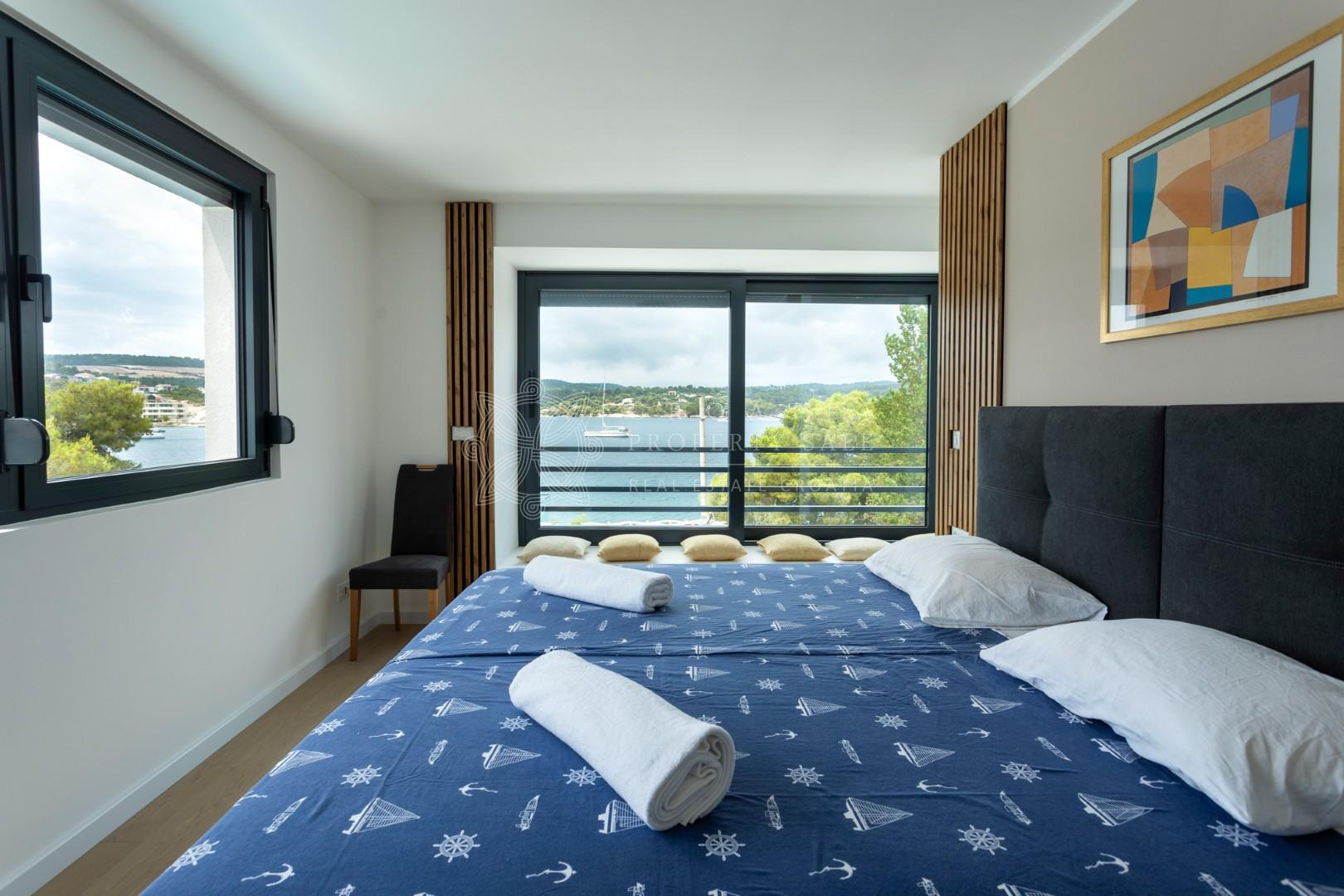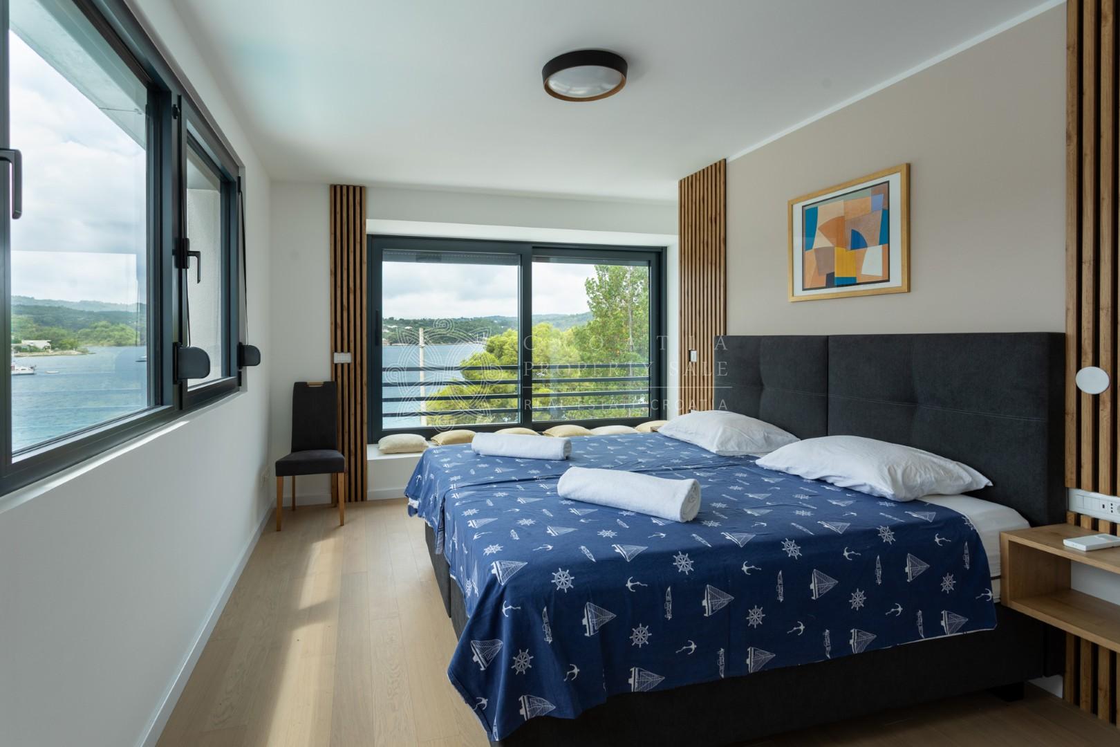 On this floor is the master bedroom with its own bathroom and dressing room. This room offers a beautiful view of the sea with wall-to-wall windows. From the inner living room, stairs lead to the second floor, where there are two more bedrooms, each with its own bathroom. Each room has a beautiful view of the sea. One of the rooms has a spacious terrace and prepared equipment for installing a whirlpool from which the sea view is spectacular. Each room has built-in blinds that are electrically lowered and raised. All rooms have air conditioning for cooling and heating. Water is heated via a central boiler for all bathrooms, showers and the kitchen. The pool equipment is located in the engine room under the pool. The villa is surrounded by cultivated greenery.