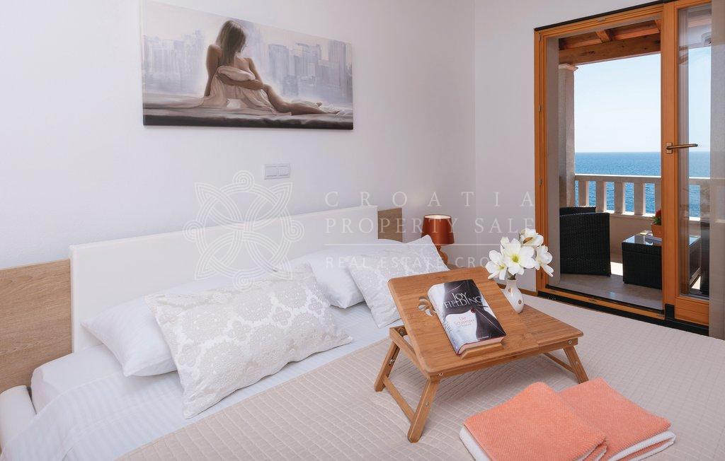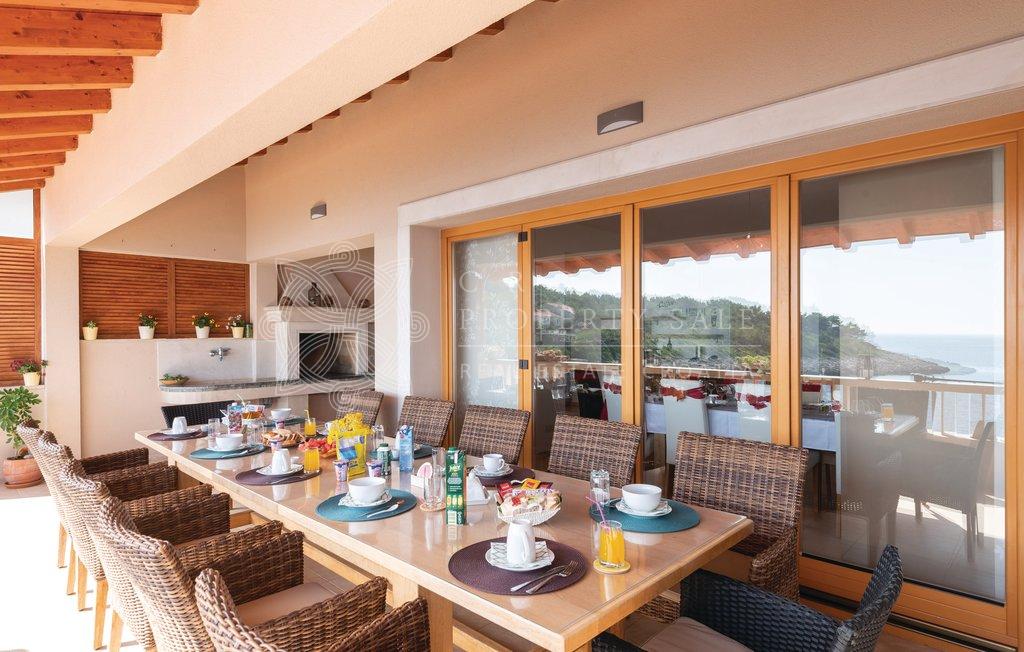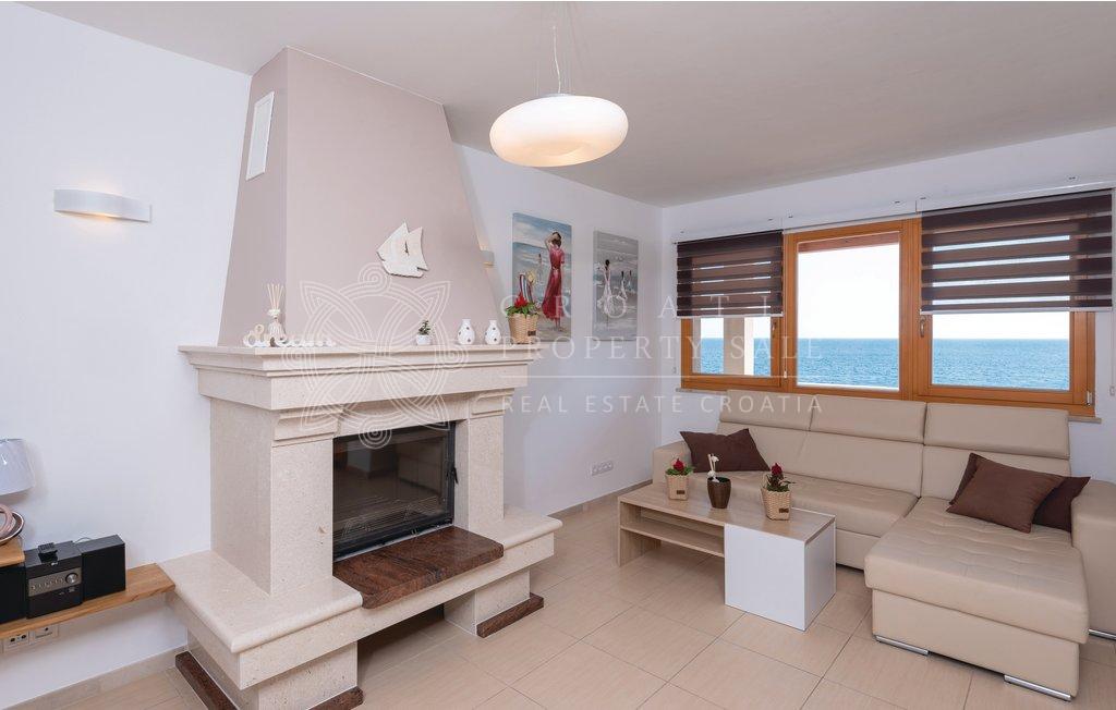 On the first floor, three elegant bedrooms open onto private balconies, each offering stunning vistas of the Adriatic. The second level features a designer kitchen, open dining space, a panoramic sea-view terrace, and a welcoming living area with fireplace – perfect for cozy evenings or family gatherings.