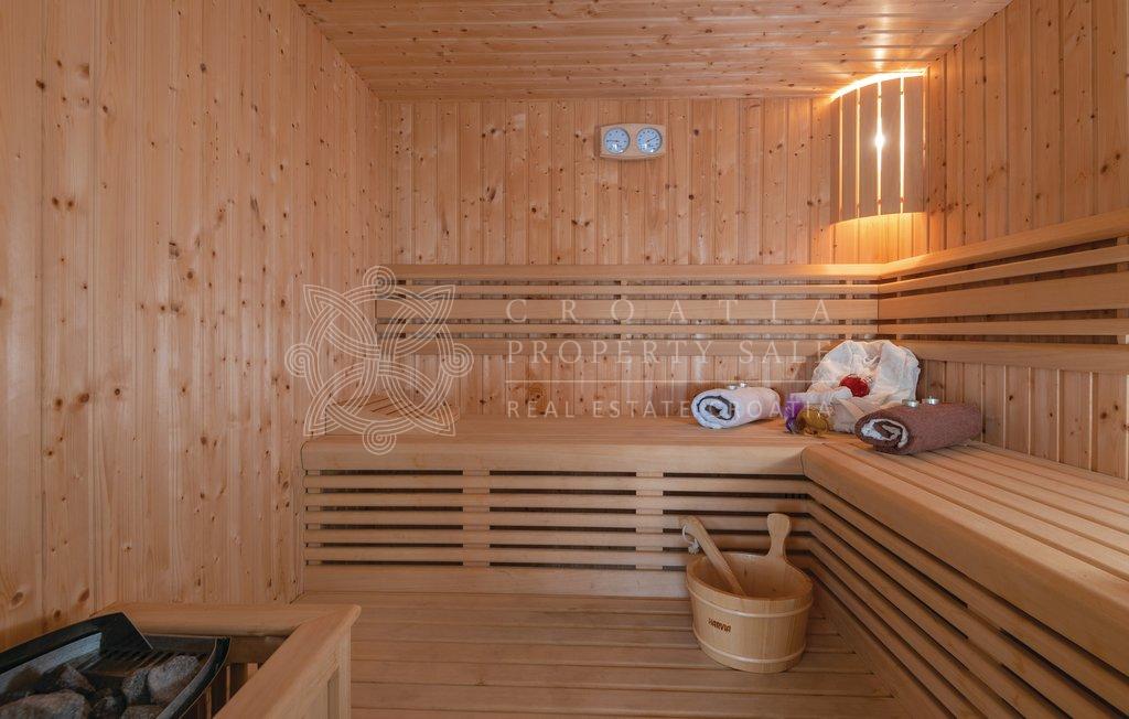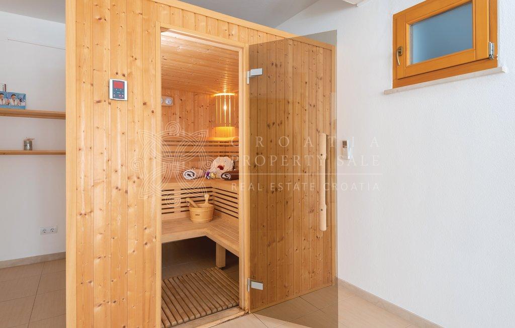 Downstairs, the ground level is a wellness retreat in itself, featuring a massage shower, jacuzzi, sauna, billiards, table football, and a compact gym. Step outside to a private oasis where a swimming pool is surrounded by mature greenery, leading to a private seaside platform perfect for lounging and enjoying the crystal-clear waters.
